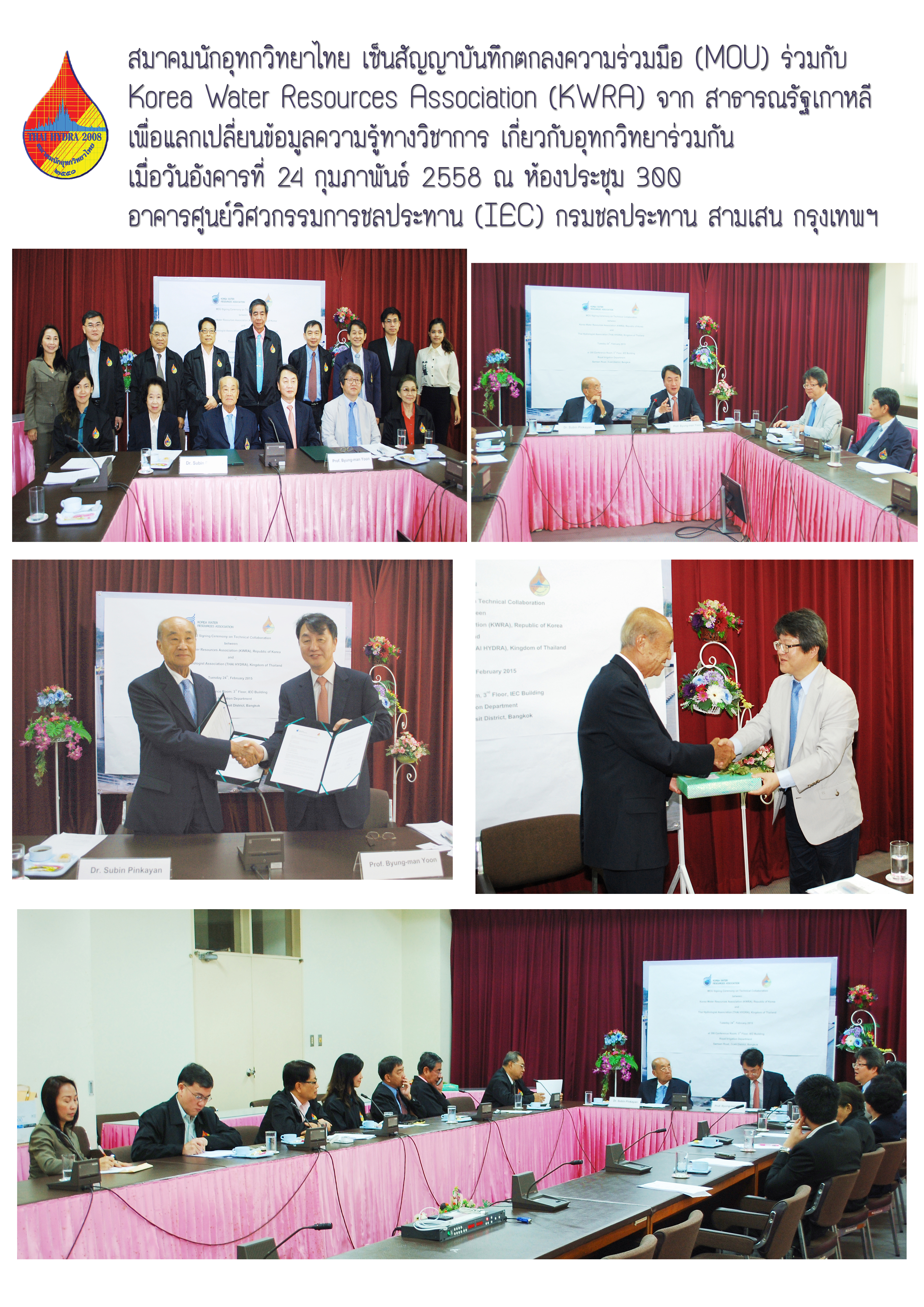 สมาคมนักอุทกวิทยาไทย ได้ลงนามทำสัญญาบันทึกตกลงความร่วมมือ (MOU) ร่วมกับ Korea Water Resources Association (KWRA) จากสาธารณรัฐเกาหลี เพื่อแลกเปลี่ยนข้อมูลความรู้ทางวิชาการ เกี่ยวกับอุทกวิทยาร่วมกัน เมื่อวันอังคารที่ 24 กุมภาพันธ์ 2558 ณ ห้องประชุม 300 อาคารศูนย์วิศวกรรมชลประทาน (IEC) กรมชลประทาน สามเสน กรุงเทพฯ