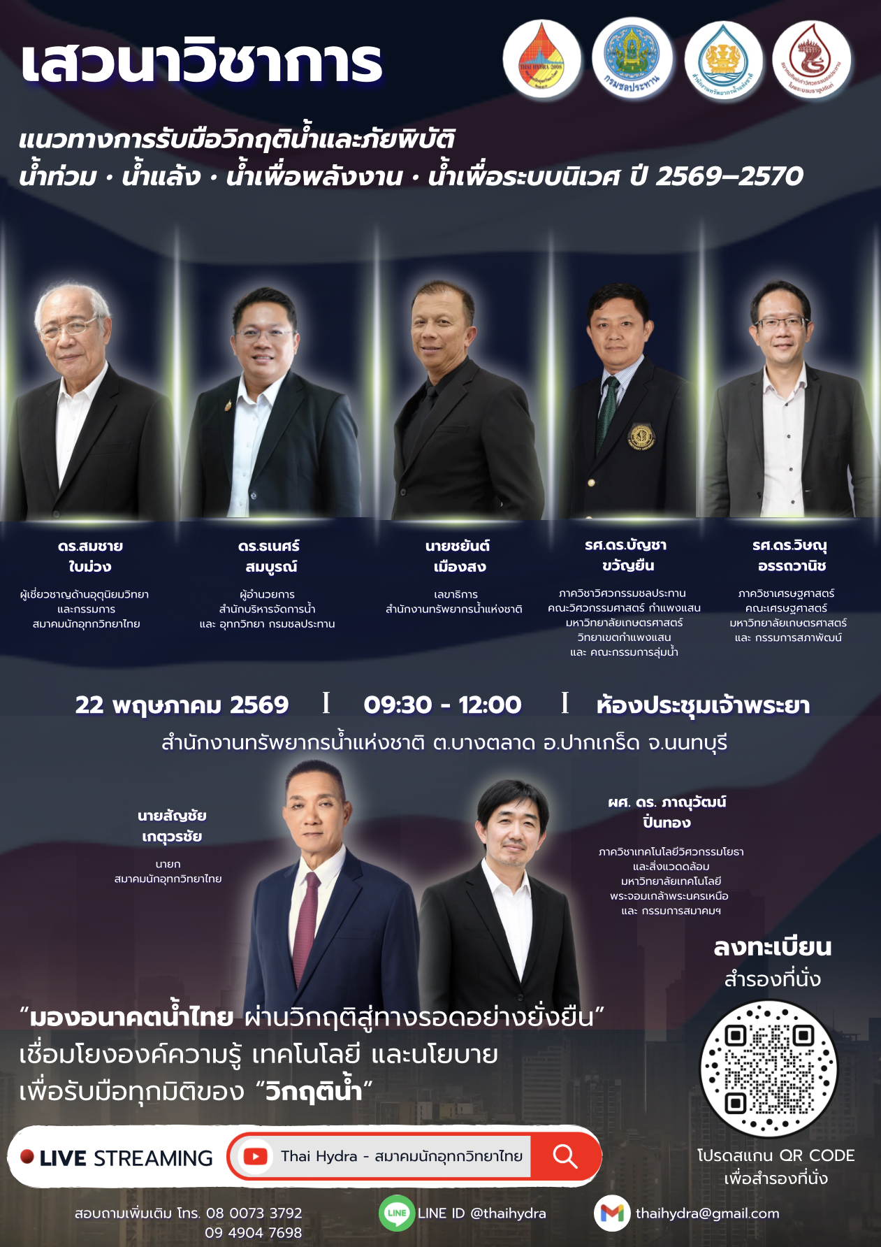 ปีนี้…น้ำจะมาแบบไหน? น้ำท่วม? น้ำแล้ง? หรือมากกว่าที่คิด มาหาคำตอบด้วยกันในงาน เสวนาวิชาการ เรื่อง " แนวทางการรับมือวิกฤติน้ำและภัยพิบัติ น้ำท่วม • น้ำแล้ง • น้ำเพื่อพลังงาน • น้ำเพื่อระบบนิเวศ ปี 2569–2570 " 📅 วันศุกร์ที่ 22 พฤษภาคม 2569 ⏰ 09:30 – 12:00 น. 📍 ห้องประชุมเจ้าพระยา ชั้น 1 สำนักงานทรัพยากรน้ำแห่งชาติ อ.ปากเกร็ด จ.นนทบุรี 💡 อัปเดตแนวโน้ม “วิกฤติน้ำไทย” 💡 รับมือยังไงให้ทัน ก่อนจะสายเกินไป 💬 ฟังจากผู้เชี่ยวชาญตัวจริง 📌 ลงทะเบียนฟรี! สำรองที่นั่งได้ที่ Link : https://docs.google.com/.../1FAIpQLSdNAmFnn1L.../viewform... 📌มีการประชุมใหญ่สามัญประจำปี 2569 (เฉพาะสมาชิก) ** หลังจบงานเสวนาวิชาการในเวลา 12:00-12:30 น. จัดโดย สมาคมนักอุทกวิทยาไทย ร่วมกับ สำนักงานทรัพยากรน้ำแห่งชาติ • กรมชลประทาน • สมาคมศิษย์เก่าวิศวกรรมชลประทาน ในพระบรมราชูปถัมภ์ ✨ อย่ารอให้วิกฤตมาถึง…มาเตรียมพร้อมไปด้วยกันตั้งแต่วันนี้
